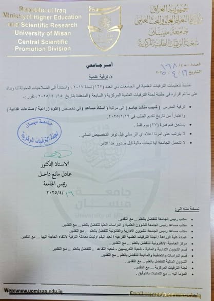 تتقدم عمادة كلية الزراعة- جامعة ميسان متمثلة بالسيد العميد الأستاذ المساعد الدكتور ضرغام صبيح كريم، والسادة المعاونين والسادة رؤوساء الأقسام والتدريسين والموظفين، بأرق التهاني والتبريكات الى المدرس شبيب منشد جاسم التدريسي في كليتنا بمناسبة ترقيتة الى مرتبة (أستاذ مساعد) في تخصص علوم زراعية/ صناعات غذائية.