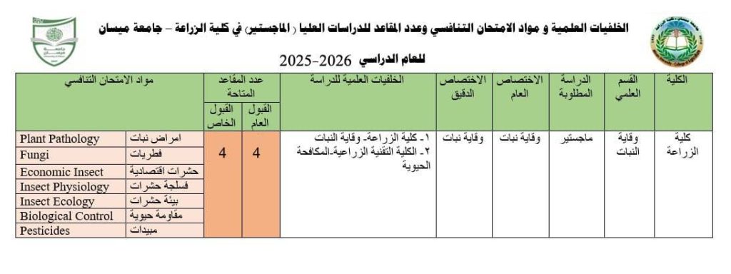 تعلن كلية الزراعة عن مواد الامتحان التنافسي وعدد المقاعد والخلفيات العلمية للتقديم لدراسة الماجستير في جامعة ميسان – كلية الزراعة – قسم وقاية النبات للعام الدراسي ٢٠٢٥-٢٠٢٦.