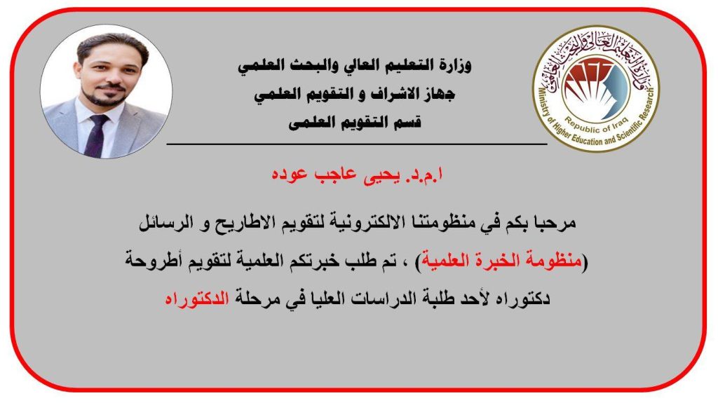 اختير الأستاذ المساعد الدكتور يحيى عاجب عودة التدريسي في كلية الزراعة/ قسم الإنتاج الحيواني كمقيم علمي في تقييم الرسائل والاطاريح العلمية لطلبة الدراسات العليا في منظومة الخبرة العلمية التي أطلقتها وزارة التعليم العالي والبحث العلمي والغرض منها اختصار الوقت أمام طلبة الدراسات العليا عبر المنظومة الالكترونية، فقد تم اختيار الأستاذ المساعد الدكتور يحيى عاجب عودة كمقيم علمي لأطروحة دكتوراه لأحد طلبة الدراسات العليا بناءا على السمعة العلمية التي يتمتع بها من خلال المشاركة في تقييم العديد من البحوث العلمية المنشورة في المجلات العلمية ضمن المستوعبات العالمية مثل سكوبس وكلاريفيت بالإضافة الى تقييم أبحاث المؤتمرات والمجلات المحلية.