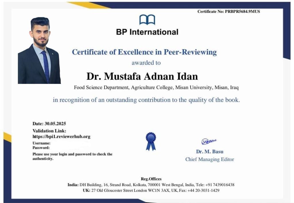 أُختير المدرس الدكتور مصطفى عدنان عيدان، التدريسي في كلية الزراعة بجامعة ميسان، مقيِّماً علمياً لأحد فصول كتاب علمي تصدره المجلة العالمية BP International الصادرة من الهند، والتي تُعنى بنشر الكتب والبحوث العلمية الرصينة في مجالات العلوم الزراعية والتغذية.