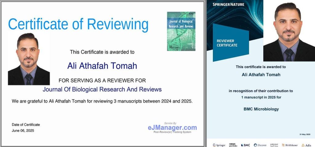 في إنجاز علمي جديد يعكس المكانة الأكاديمية المتميزة للكوادر التدريسية في جامعة ميسان، اختير الأستاذ الدكتور علي عذافة طعمة، التدريسي في قسم وقاية النبات – كلية الزراعة، كمقيم علمي لبحثين احدهما للمجلة العالمية BMC Microbiology، الصادرة عن دار النشر الرصينة Springer Nature، والتي تصنّف ضمن الربع الأول (Q1) في مستوعبات Scopus وClarivate. والبحث الثاني للمجلة العالمية Journal of Biological Research and Reviews البلجيكية.
