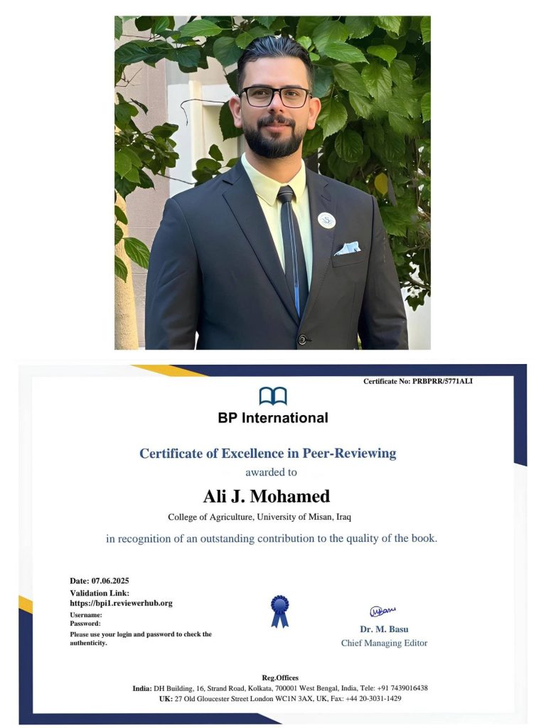 اختير المدرس المساعد علي جاسم محمد، التدريسي في كلية الزراعة بجامعة ميسان، مقيِّماً علمياً لأحد فصول كتاب علمي تُصدره المجلة العالمية BP International، الصادرة من الهند، والمختصة بنشر الكتب والبحوث العلمية الرصينة في مجالات العلوم الزراعية.
