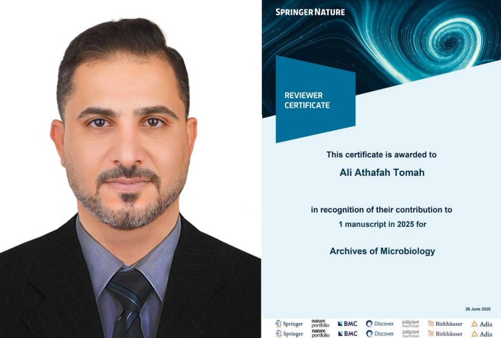 أختيارالأستاذ الدكتورعلي عذافة طعمة التدريسي في قسم وقاية النبات – كلية الزراعة بجامعة ميسان كمقيم لبحث علمي في المجلة العالمية (Archives of Microbiology) التابعة لدار النشر العالمية Springer Nature التي تقع ضمن مستوعبات سكوباس وكلاريفيت وذات معامل تأثير Q2، حيث يعد البحث المقيم من البحوث الدور الخاص باحد انواع الفطر Trichoderma مجموعةمن الانزيمات المتورطة في المقاومة الحيوية ضد مرض الذبول البكتيري على شتلات الحمضيات.