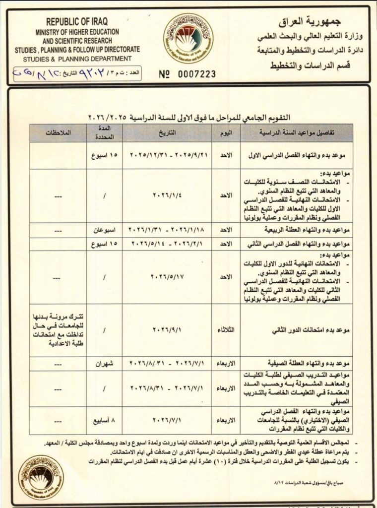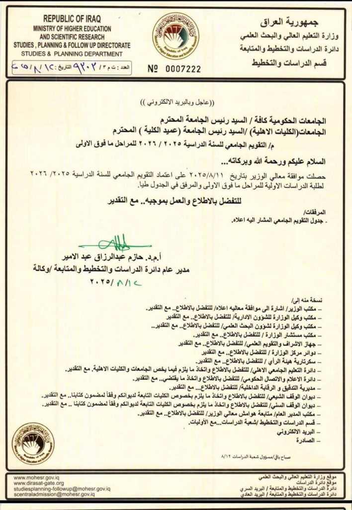اخبار الكلية وزارة التعليم العالي تعتمد التقويم الجامعي للسنة الدراسية 2025/2026 12 أغسطس، 202512 أغسطس، 2025 أعلنت وزارة التعليم العالي والبحث العلمي، دائرة الدراسات والتخطيط والمتابعة، على اعتماد التقويم الجامعي للسنة الدراسية 2025/2026 للمراحل الدراسية (ما فوق المرحلة الأولى) .