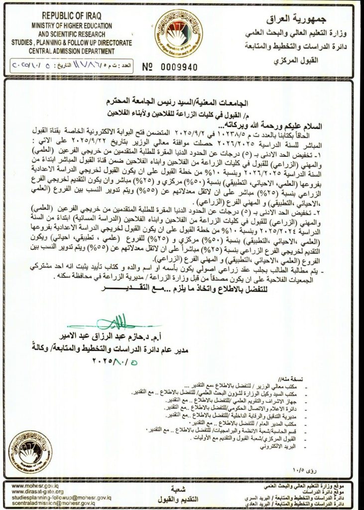 التعليمات الخاصة بقبول الفلاحين واولاد الفلاحين في كلية الزراعة