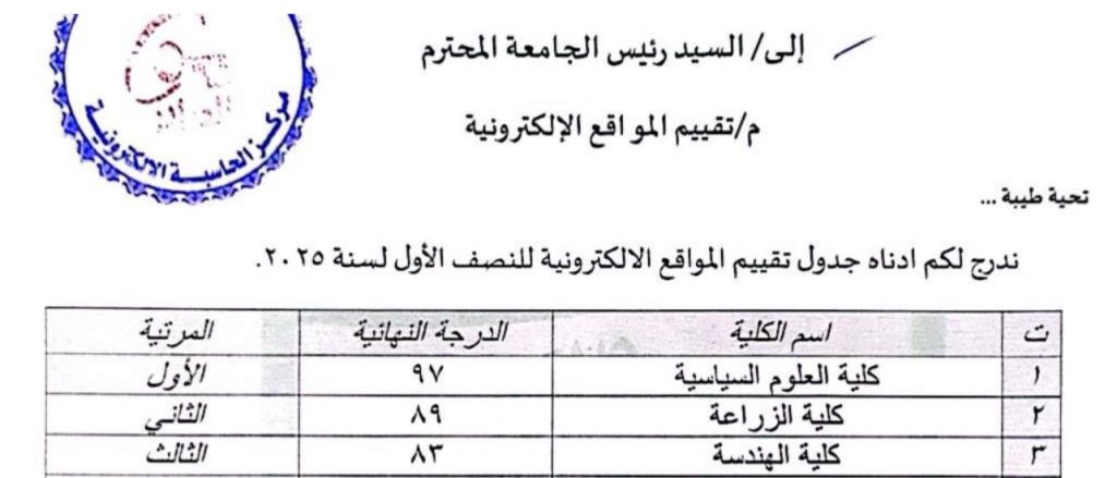في إطار السعي المتواصل نحو تطوير الأداء الرقمي وتعزيز جودة الخدمات الإلكترونية، حصدت كلية الزراعة – جامعة ميسان المركز الثاني في تقييم المواقع الإلكترونية للكليات للمدة النصفية الأولى من عام 2025، وفقًا للتقرير الصادر عن مركز الحاسبة الإلكترونية في جامعة ميسان.