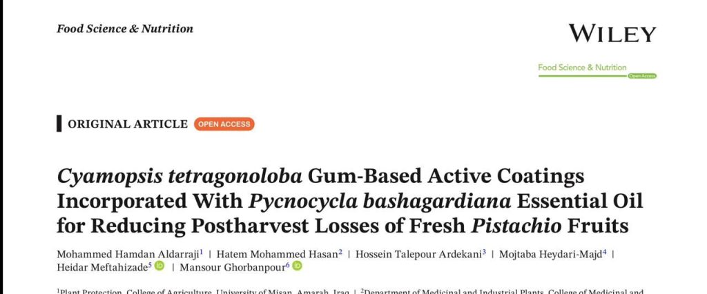ملخص البحث هو معالجة مشكلة الامراض النباتية وحفظ الاغذية بعد الحصاد من السموم الفطرية ويخدم الصالح العام حيث استخدم طلاءات حيوية قائمة على صمغ الغوار ومُدعّمة بزيت Pycnocycla bashagardiana العطري للتقليل من خسائر ما بعد الحصاد في ثمار الفستق الطازجة .