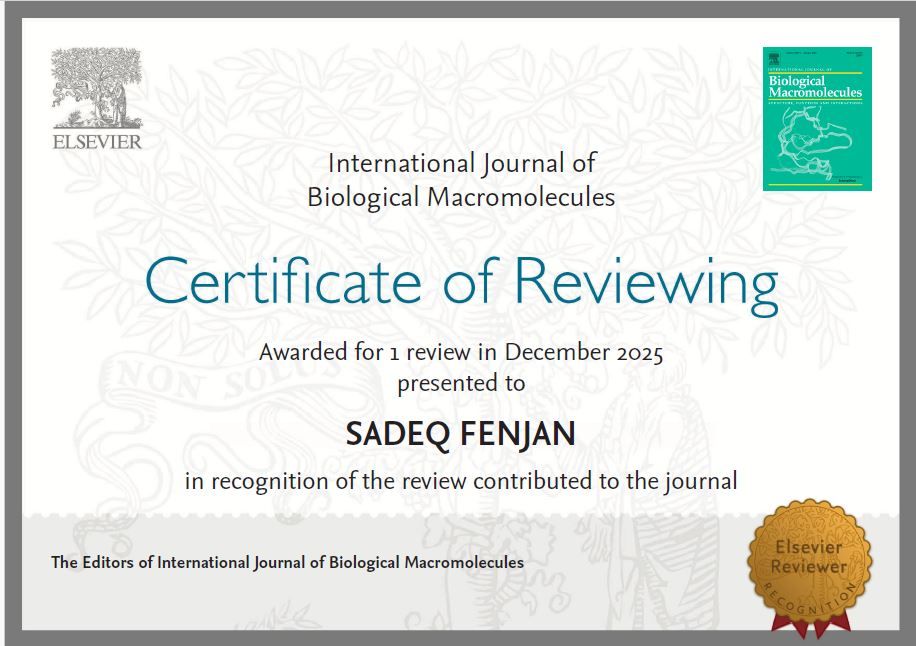 اختير التدريسي في كلية الزراعة من قسم علوم الأغذية م.د صادق فنجان حسناوي في تقييم بحث علمي مقدم من مجلة ( International Journal of Biological Macromolecules ) والتي تقع ضمن مستوعبات Scopus و Clarivate وتحمل Impact Factor (8.5) و CiteScore (6.9) . ومصنفه ضمن تصنيف الربع الثاني Q2.