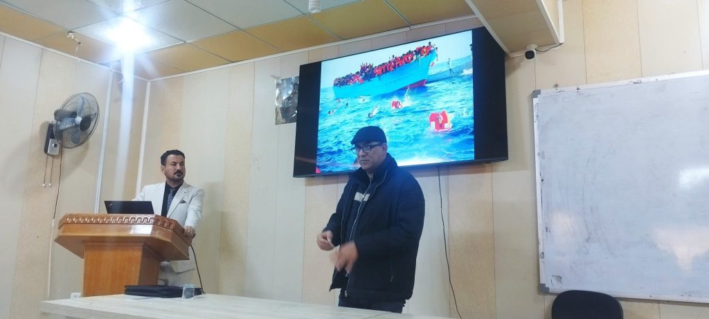 وتناولت الندوة تجربة واقعية من خلال استضافة رسام الكاريكاتير حامد وهيب جبر، الذي ألقى كلمة استعرض فيها تجربته الشخصية في الهجرة غير الشرعية، موضحًا حجم المخاطر والمعاناة التي تعرّض لها خلال تلك الرحلة، وما واجهه من تحديات إنسانية ونفسية جسيمة.