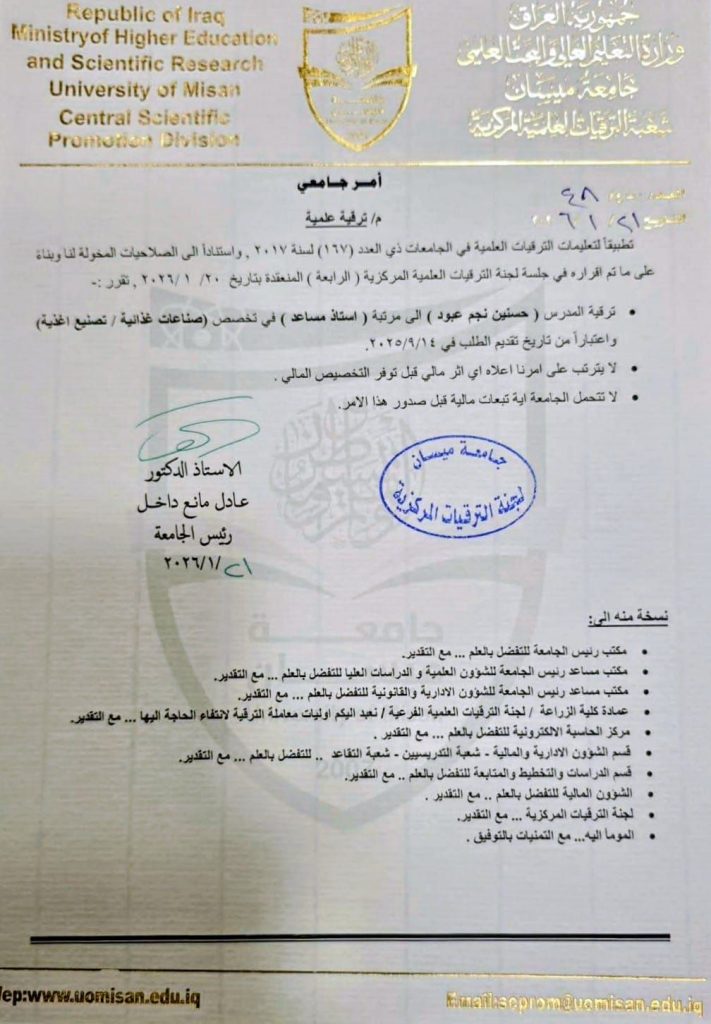 حصل المدرس المساعد (حسنين نجم عبود) التدريسي في كلية الزراعة- جامعة ميسان، على ترقية علمية لمرتبة (أستاذ مساعد) بعد أستكمال متطلبات الترقية المنصوص عليها في قانون الترقيات العلمية.
