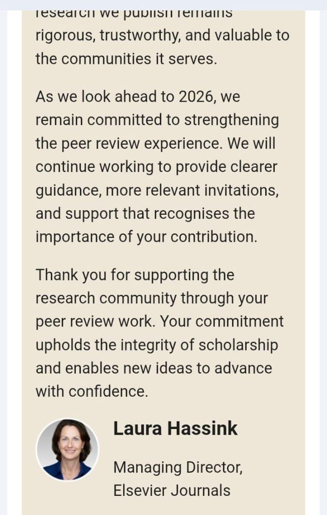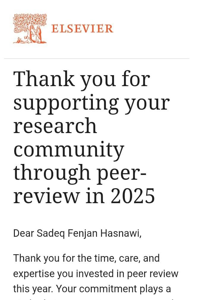 منحت دار النشر العالمية Elsevier كتاب شكر وتقدير للتدريسي في كلية الزراعة- قسم علوم الأغذية الدكتور صادق فنجان حسناوي نظرا للجهود المبذولة من قبله في تقييم بعض البحوث لعام 2025 لمجلاتها والتي تقع ضمن مستوعبات Scopus و clarivate