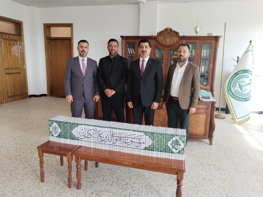 استقبل السيد عميد الكلية الأستاذ الدكتور ضرغام صبيح كريم والسيد المعاون العلمي الاستاذالمساعد الدكتور احمد مالك جمعة مدير قسم الأنشطة الطلابية في الجامعة ا.م.د ماجد محمد مساعد والوفد المرافق له وممثلا عن العتبة العباسية المقدسة مؤسسة الوافي قسم مؤسسة الوافي للتوثيق حيث قدم الوفد «موسوعة فتوى الدفاع الكفائي» هديةً علمية الى عمادة الكلية.