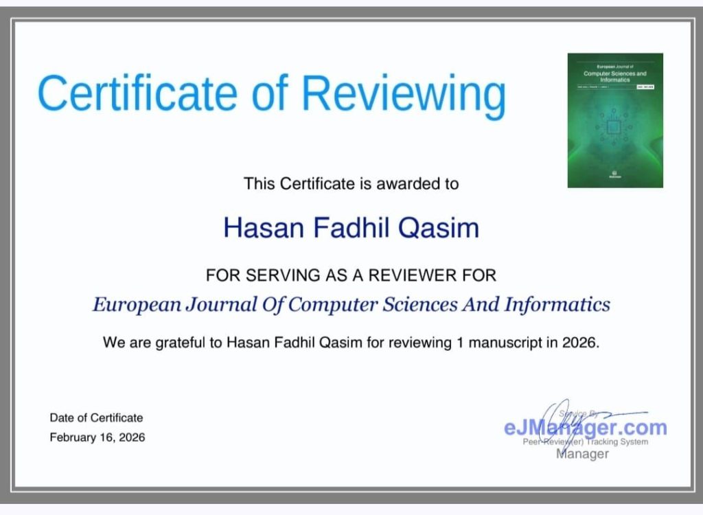 اختير م.م . حسن فاضل قاسم مقوماً علمياً لبحث علمي بعنوان ‘Quantum – Behaved Pso–based Feature Extraction with Adaptive Extreme Learning Machine (qpso–aelm) Classifier for Ckd and Cvd Prediction’ خلال هذا الاسبوع في مجلة علمية عالمية ودولية European Journal of Computer Sciences and Informatics والتي تسهم في مد جسور التعاون العلمي بين جامعة ميسان من جهة والجامعات العالمية و الدولية من جهة أخرى.