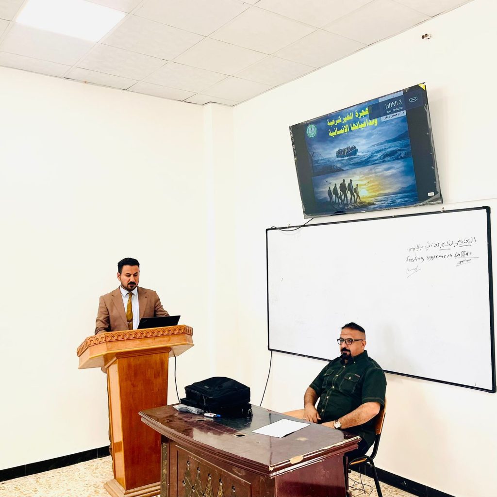 التي حاضر فيها كل من م.م حازم زهراو صحن، وم.م عباس لعيبي عبيد، وم.م حسين زغير جاسم، تحليلاً عميقاً لجذور ظاهرة الهجرة غير النظامية، مستعرضةً المسببات الاقتصادية والاجتماعية والسياسية التي تدفع الشباب نحو هذا الخيار المحفوف بالمخاطر. كما سلط المحاضرون الضوء على واقع الهجرة في المنطقة، مع كشف الانتهاكات الجسيمة لحقوق الإنسان التي يتعرض لها المهاجرون عبر طرق التهريب غير الآمنة.