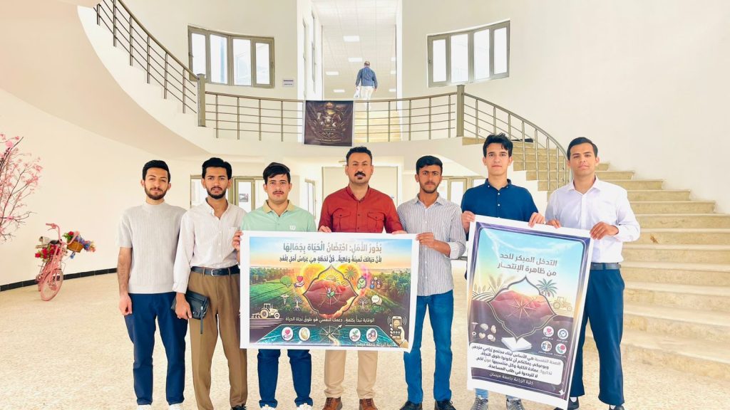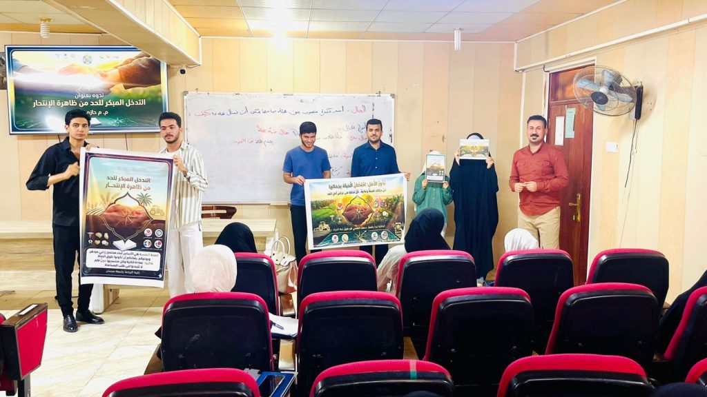 ضمن حملة وزارة التعليم العالي والبحث العلمي للحد من ظاهرة الانتحار، نظّمت كلية الزراعة في جامعة ميسان نشاطاً صفياً تطوعياً توعوياً، تمثل بطباعة وتوزيع ملصقات إرشادية بأحجام مختلفة، ونشرها في أروقة الكلية بمشاركة فاعلة من طلبتها.