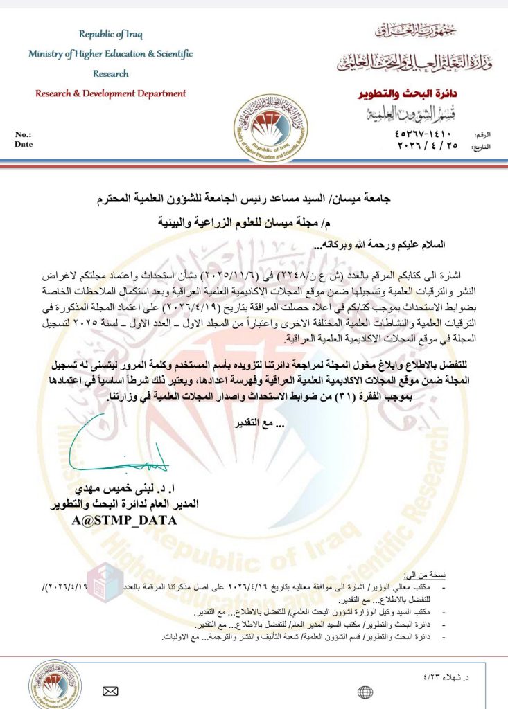 ويأتي هذا الاعتماد استناداً إلى الكتاب وزارة التعليم العالي والبحث العلمي – دائرة البحث والتطوير – قسم الشؤون العلمية ، وتعد هذه الخطوة إنجازاً نوعياً لكلية الزراعة بجامعة ميسان، حيث توفر منصة علمية رصينة ومسجلة ضمن موقع المجلات الأكاديمية العلمية العراقية (IASJ) لخدمة الباحثين في الاختصاصات الزراعية والبيئية.