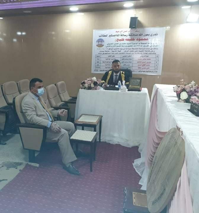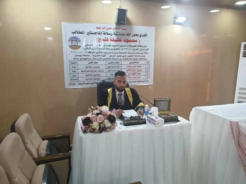 ناقشت رسالة الماجستير في جامعة ميسان/كلية التربية /قسم اللغة العربية /فرع اللغة الموسومة(الوجيزة للسيد محمد بن الحسن الحسيني الخُراساني المتوفى (1322هـ) تحقيق ودراسة القسم الأول والثاني)،التي تقدم بها طالب الدراسات العليا (محمود خليفة فليح)وبإشراف الاستاذ المساعد الدكتور علي موسى عكله .وقد هدفت الدراسة إذ أشارَ الى الاقتصار على التحقيقُ في القسمينِ الأولَ والثاني من أصلِ أربعةِ أقسامٍ؛ وذلكَ لسعةِ الكتابِ الذي تضيقُ بهِ فترةُ كتابةَ الماجستير، ولكونِ القسمينَ المذكورين يناسبانِ تخصُّصَ اللغةِ العربية.ومن الجدير بالذكر أن المخطوط تضمن اثني عشر علماً في مجالاتٍ معرفيةٍ مختلفةٍ كاللغةِ، والفقهِ، والصرفِ، والنحوِ، والأدبِ، والبلاغةِ، والعروضِ وغيرِها، لأن مؤلفيها أراد أن يجمع علوم عدة في كتاب موجز.واعتمد الباحث في تحقيقهِ ثلاثَ نِسخٍ مخطوطةً، جاعلاً نسخةَ (مكتبةِ مجلسَ الشورى الإسلامي) المرموزَ لها بـ(الأصلِ) هي النسخةَ الأمّ؛ لكونِها أتمَّ النسخِ، وأحسَنَهَا خطّاً، وأقلّها خطأً، وهي آخرَ نِسخةٍ كتبها المؤلفُ من أصلِ ثلاثةَ نِسخٍ بخطهِ، وقد عارضتُها بعدَ كتابتِها بنسختينِ أُخريين، هما: نِسخةُ (مكتبةِ خوي) ورمزُها (خ)، ونسخةُ (مكتبةِ مشهد) ورمزُها (م)، ومنْ ثُمَّ ذكرتُ المهمَّ من الفُروقِ في الهامشِ.والذي دعاني إلى تحقيقِهِ كونُهُ لم يَنَلْ حَظَّهُ من التحقيقِ العلميّ الذي يَليقُ به، ولم يَرَ النورَ كي ينهلَ منه الدارسون والباحثون , وقدْ اقتضت طبيعةُ تحقيقَ هذا الكتابَ أنْ تنقسمَ الرسالةُ على قسمينِ:(القسمُ الأوّل): الدِراسةُ، و(القسمُ الثاني): النصُّ المحققُ، واستدعت مادةَ الدِراسةِ تقسيمُها على: تمهيدٍ، وثلاثةِ فصولٍ، وخاتمة , فالتمهيدُ: تضمّنَ ترجمةً وافيةً للمصنفِ، وبيانَ مؤلَفَاتهِ التامةِ وغيرِ التامةِ بما ذكرتهُ التراجمُ، وما ذكرهُ المصنّفُ في ترجمتهِ لنفسهِ الذي ذيّلَ بها احدى النسخِ التي كتَبَها بخطِّه.أمّا الفصلُ الأولِ: والذي بعنوان (كتابُ الوجيزةِ)، فقد اشتملَ على: اسمِ الكتابِ ونسبتِهِ إلى المؤلفِ، ومحتواهُ وملامحَ من منهجهِ، وأُسلوبِهِ في الكتابةِ والنقلِ والتوثيقِ، ومصادرِ الكتابِ وشواهدِهِ.وجاءَ الفصلُ الثاني بعنوانِ (شخصيةُ المصنّفِ) وتضمّنَ الحُدودَ الصرفيةِ والنحويةِ، وآراءَهُ وترجيحاتِهِ العلمية، ومسائلَ الخلافِ في كتابِهِ، وموقِفَهُ من المدارسِ النحويةِ,وتضمن الفصلُ الثالثِ بيانَ النِسخِ المعتمدةِ في التحقيقِ، والمنهجَ المتبّعَ فيه.وخصّصت (الخاتمةَ) بذكرِ أهمَّ النتائجَ التي توصلَّ إليها البحثُ في قسمي الدراسةِ والتحقيقِ.، نذكر منها ما يلي:1- إنّ نسبه كتاب (الوجيزة) إلى السيد محمد بن الحسن الحسيني الخُراساني لم تكن مورد شكّ من أحد، وهو منسوب إليه بشكل واضح وصريح في النسخ المعتمدة، والمصادر التي ذكرتها.2- لم يتصدَّ أحد لطباعة كتاب (الوجيزة)، أو تحقيقه، وهذه هي المرة الأولى التي يرى فيها النور، ويحظى بالدراسة والتحقيق.3- تنوع أسلوب المصنف في النقل، فقد نقل الخُراساني تارة بالنص، وتارة أُخرى بالمعنى، وفي أحيان قليلة يذكر المصدر دون المؤلف، أو المؤلف دون المصدر، أو يذكر القول دون المؤلف والمصدر.4- وقف الخُراساني موقف وسطاً، فلم يتبنَّ مدرسة نحوية معينة في عرض مادة كتابه.5- عنايته واهتمامه بالتصحيح أو الصواب اللغوي، فقد أشار إلى أغلاط وأوهام كثيرة ذكرها النحاة قبله.6- الإيجاز والاختصار سمة لامعة في الكتاب، تتناسب مع عنوانه والغاية من تأليفه.