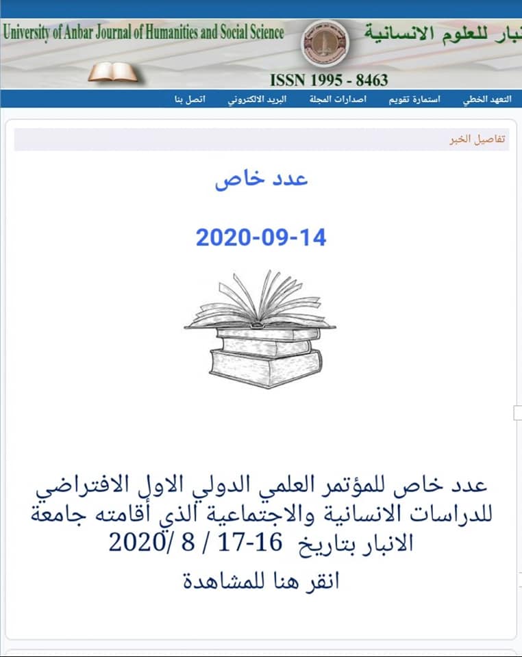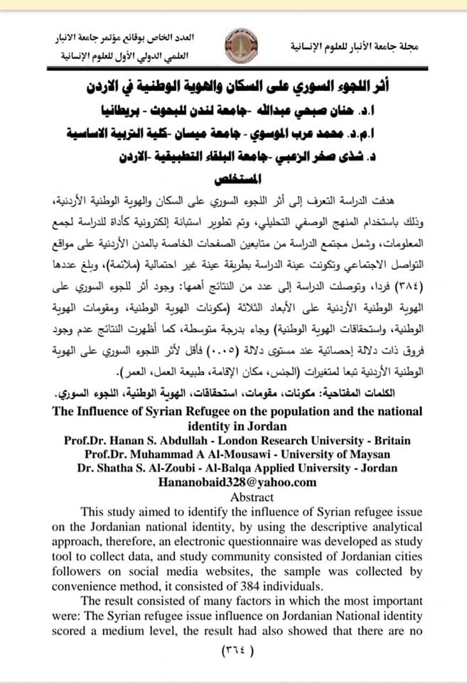 نشرت مجلة الأنبار للعلوم الأنسانية البحث الموسوم ( أثر اللجوء السوري على السكان والهوية الوطنية في الأردن ) والذي شارك فيه الأستاذ الدكتور محمد عرب الموسوي / التدريسي في جامعة ميسان / رئيس قسم الجغرافيا في كلية التربية الأساسية في المؤتمر العلمي الدولي الأول الأفتراضي للدراسات الانسانية والأجتماعية الذي أقامته جامعة الأنبار خلال شهر آب الماضي .