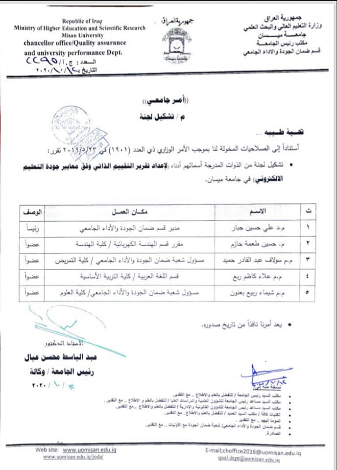 أختير التدريسي م.م علاء كاظم ربع ضمن لجنة اعداد تقرير التقييم الذاتي وفق معايير جودة التعليم الالكتروني في جامعة ميسان حسب الأمر الجامعي ذي الرقم 2295 في 12 / 10 / 2020