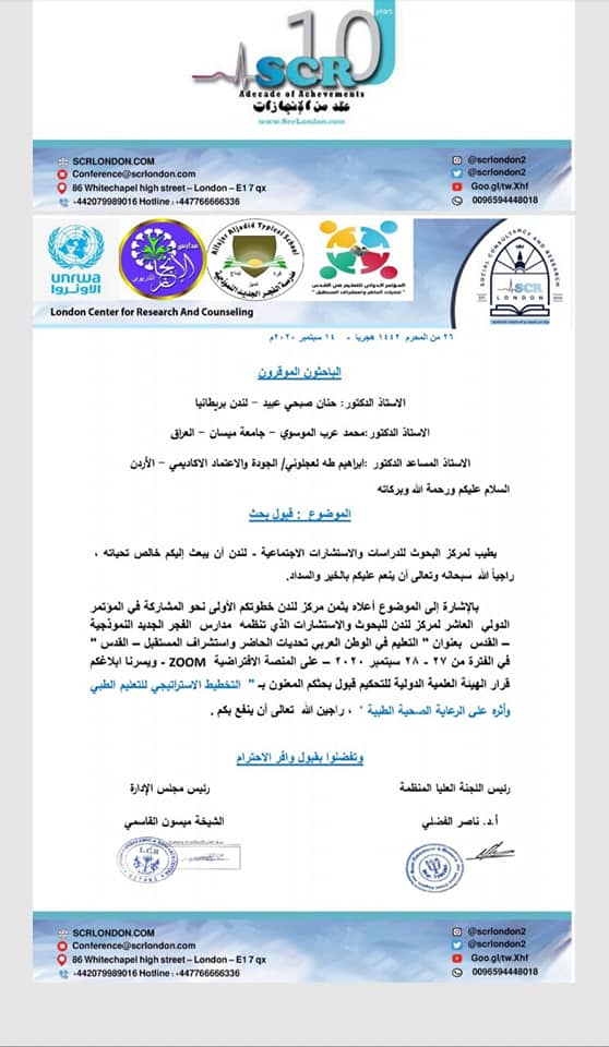يشارك الأستاذ الدكتور محمد عرب الموسوي / التدريسي في جامعة ميسان / كلية التربية الأساسية في المؤتمر الدولي العاشر لمركز لندن للبحوث والأستشارات الذي تنظمه مدارس الفجر الجديد النموذجية – القدس تحت عنوان ( التعليم في الوطن العربي تحديات الحاضر وأستشراف المستقبل – القدس ) والذي سيقام نهاية الشهر الجاري ويشارك في بحثه الموسوم ( التخطيط الأستراتيجي للتعليم الطبي واثره على الرعاية الطبية العلمية ) .