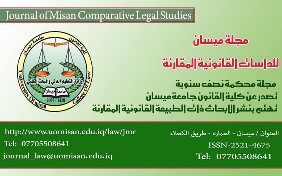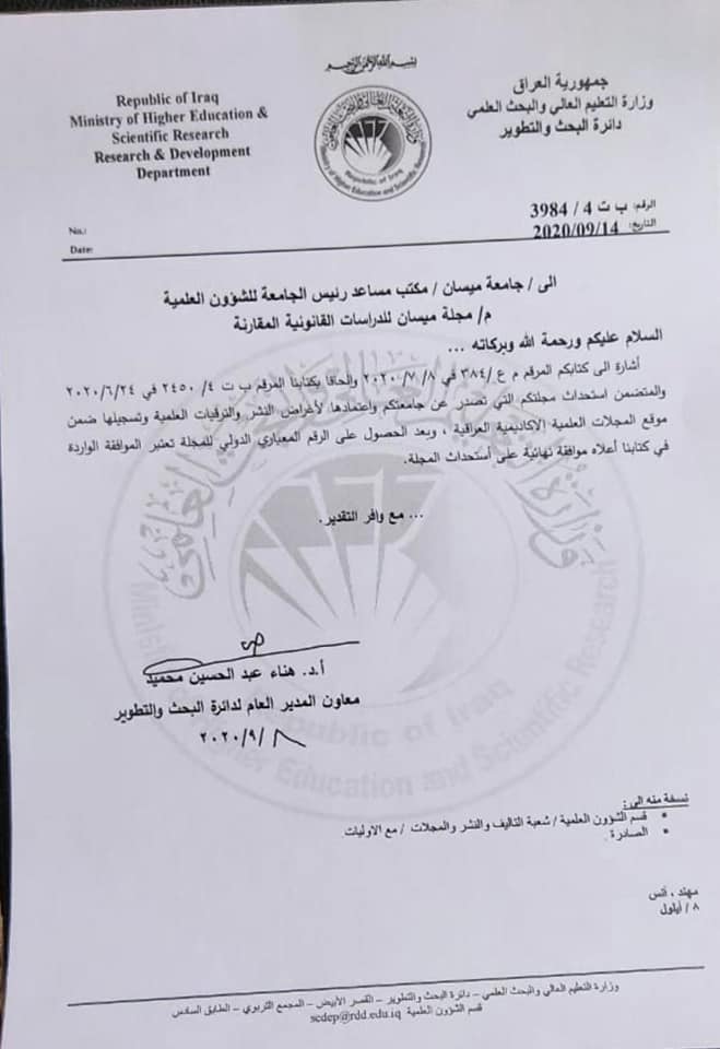 حصلت موافقة وزارة التعليم العالي والبحث العلمي/ دائرة البحث والتطوير على استحداث مجلة ميسان للدراسات القانونية المقارنة واعتمادها لاغراض النشر والترقيات العلمية وتسجيلها ضمن مواقع المجلات العلمية الاكاديمية العراقية وحصولها على الرقم المعياري الدولي . وبهذه المناسبة نود نقدم الشكر الى رئيس تحرير المجلة ا.د عامر زغير محيسن على جهوده الحثيثة والمستمرة في الاستحداث وايضا الى مدير تحرير المجلة ا. م. د. محمد سلمان محمود لمتابعته الاستحداث في الوزارة دائرة البحث والتطوير واكمال جميع المتطلبات من تسجيل المجلة في الرمز المعياري الدولي …