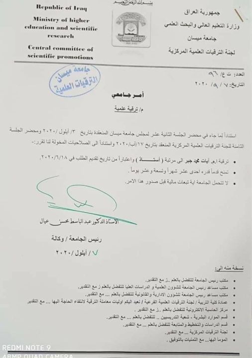 الاستاذ المساعد (آيات محمد جبر ) تحصل علــى ترقية علميــة ” أستاذ “