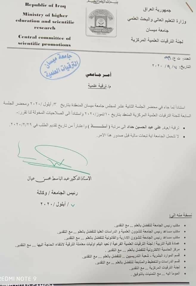 الاستاذ المساعد الدكتور (علي عبد الحسين حداد ) يحصل علــى ترقية علميــة ” أستاذ دكتور “