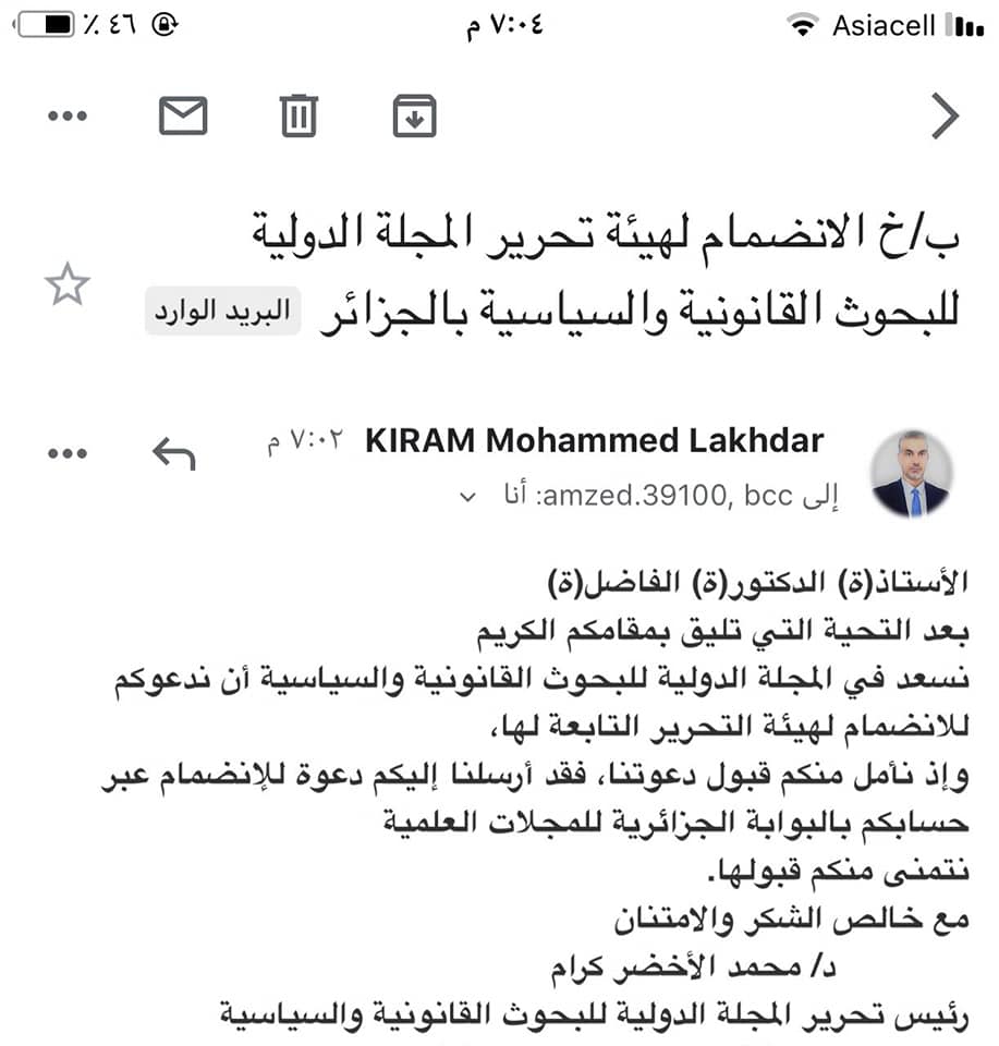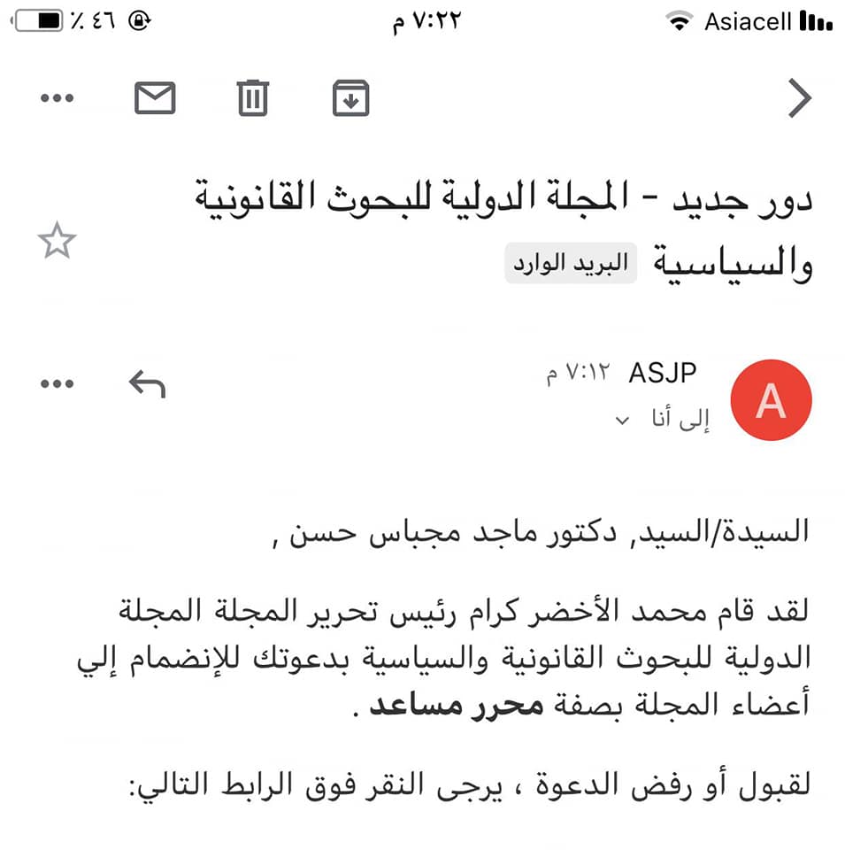 تدرريسي من كلية القانون يكلف بمهمة مساعد رئيس تحرير بعد ان اوكلت لة سابقا في المجلة العلمية بصفة محكم في البوابة الجزائرية للمجلات العلمية اصبح للدكتور ماجد مجباس حساب في البوابة الجزائرية للمجلات العلمية، فقد أوكلت له مهمة ثانية في مجلة علمية جزائرية مساعد رئيس تحرير في المجلة الدولية للبحوث القانونية والسياسية التابعة لجامعة الوادي/ الجزائر