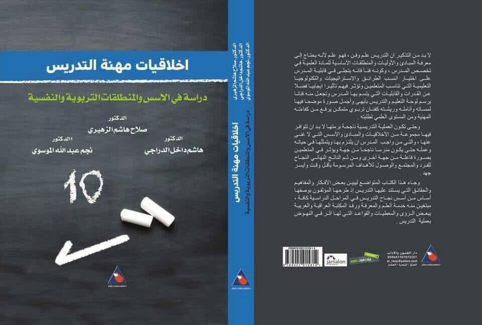 اصدر الدكتور (صلاح هاشم الزهيري) والدكتور (هاشم داخل الدراجي) والدكتور (نجم عبدالله الموسوي) اصدروا كتابهم الموسوم ( اخلاقيات مهنة التدريس .. دراسة في الاسس والمنطلقات التربوية والنفسية ).جاء الكتاب حاويا على مجموعة من الافكار والرؤى التي يحتاج اليها من يمتهن التدريس في المراحل الدراسية كافة . واكد المؤلفون في كتابهم انه حتى تكون العملية التدريسية ناجحة لابد ان تتوفر فيها مجموعة من الاخلاقيات والمباديء والاسس التي لا غنى عنها والتي من واجب المدرس ان يلتزم بها ويتمثلها في حياته وعمله لكي يستطيع ان يؤثر في المتعلمين بصورة فاعلة . جاء هذا الكتاب في فصوله المتعددة ليبين المفاهيم والحقائق الاصيلة لنجاح التدريس بدء من الكفايات التدريسية مرورا بالتخطيط الناجح وادارة الصف الدراسي بصورة فاعلة وسمات المدرس الجيد وواجباته فضلا عن العديد من الامور المهمة في العملية التدريسية .علما ان الكتاب طبع بطبعته الاولى في دار الفنون والاداب في البصرة بالتعاون مع دور نشر اخرى خارج العراق .