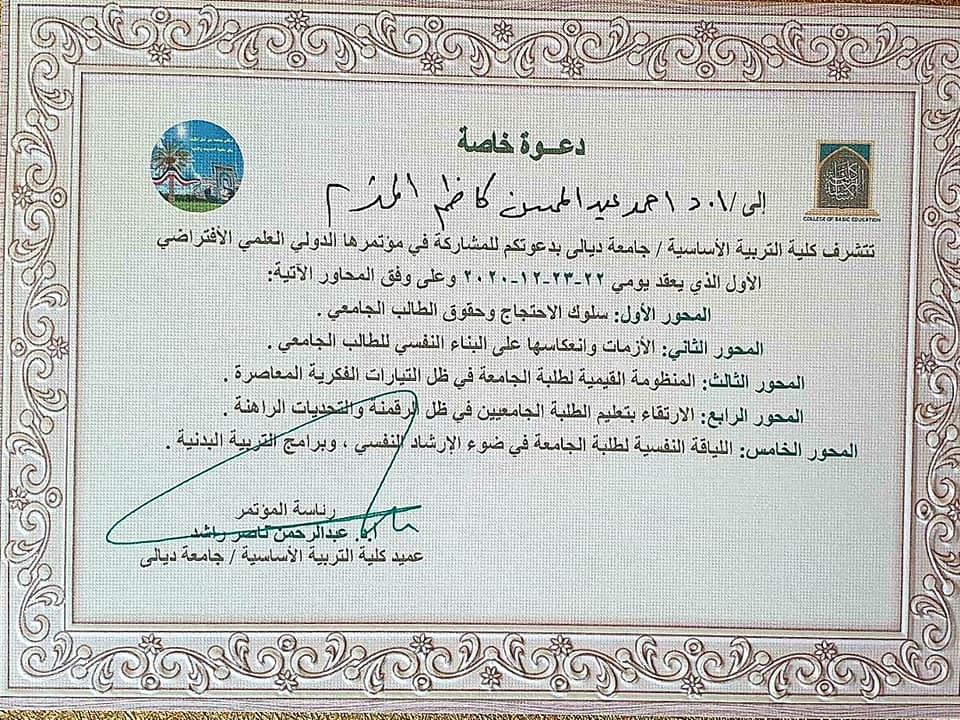 تدريسي في جامعة ميسان يتلقى دعوة رسمية للمشاركة في فعاليات المؤتمر الدولي الأفتراضي الأول الذي تقيمه جامعة ديالى