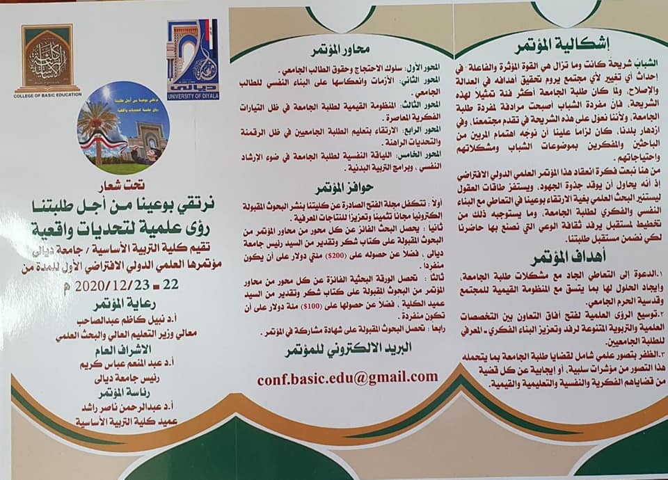 تلقى الأستاذ الدكتور أحمد عبدالمحسن كاظم الموسوي / عميد كلية التربية الأساسية دعوة رسمية للمشاركة في فعاليات المؤتمر الدولي الأفتراضي الأول الذي تقيمه جامعة ديالى / كلية التربية الأساسية والموسوم ( نرتقي بوعينا من أجل طلبتنا – رؤى علمية لتحديات واقعية ) للفتره من 22 – 23 / 12 / 2020 حيث سيتضمن المؤتمر خمسة محاور تخص الشأن الطلابي .