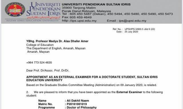 تدريسي في جامعة ميسان يشارك في أطروحة الدكتوراه