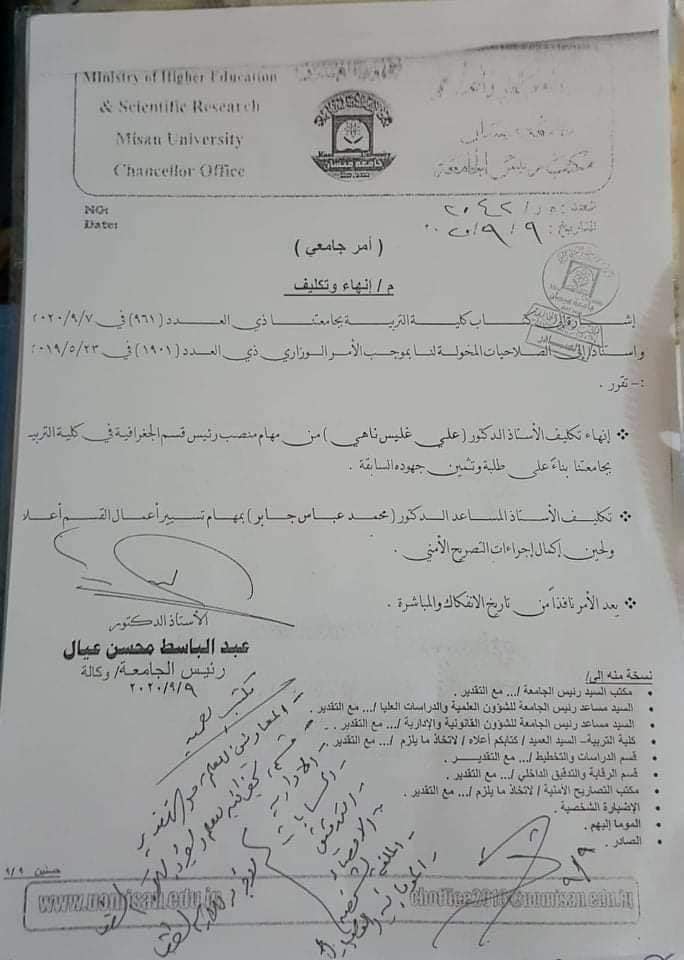 تدريسي في كلية التربية بجامعة ميسان يكلف برئاسة قسم حسب الأمر الجامعي ذي العدد ( 2042 في 2020/9/9 )