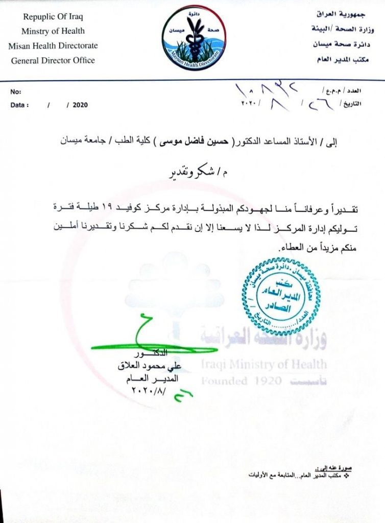 حصل الدكتور حسين فاضل موسى التدريسي في كلية الطب بجامعة ميسان على كتاب شكر وتقدير من قبل مدير عام صحة محافظة ميسان ، وذلك تثمينا لجهوده المبذولة في ادارة مركز (كوفيد – ١٩ ) في المحافظة .