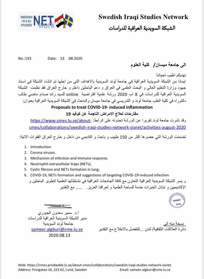 تدريسي من كلية العلوم -جامعة ميسان يقدم ورشة علمية عن مقترح لعلاج الامراض الناجمة عن فيروس كورونا في المملكة السويدية