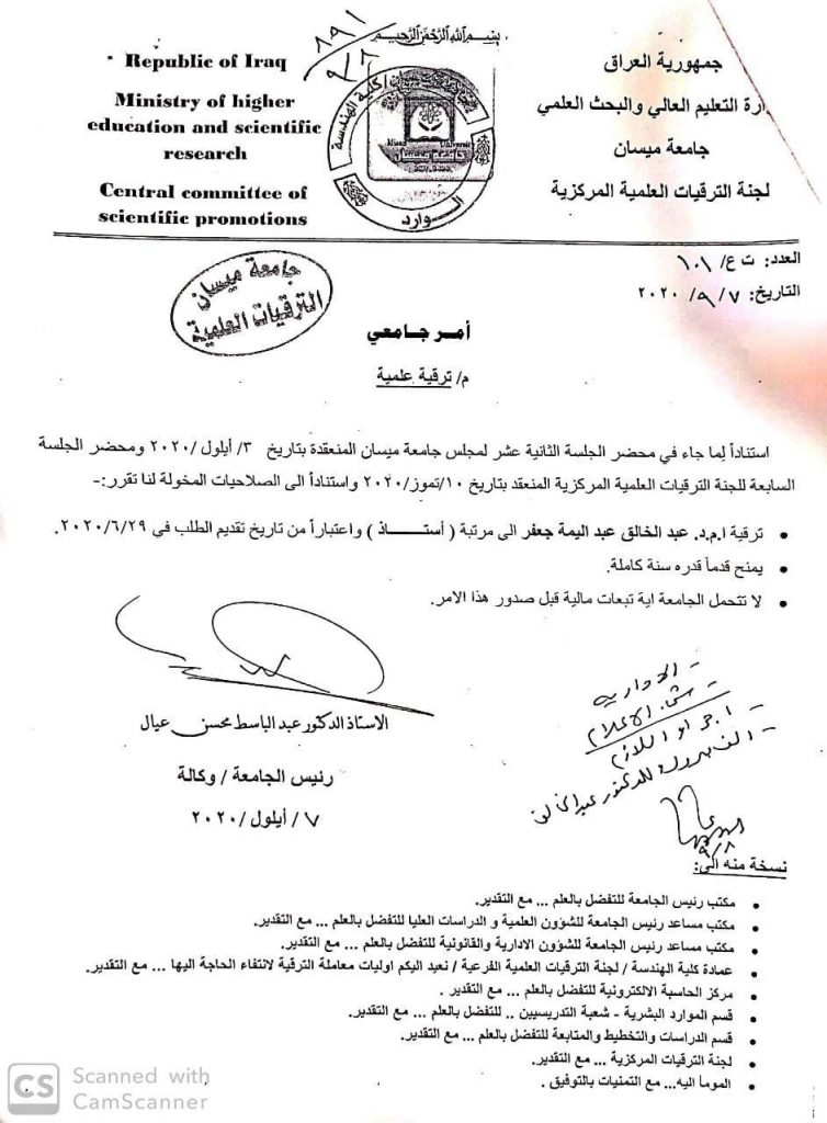 ” ترقية علمية “الاستاذ المساعد الدكتور (عبد الخالق عبداليمة جعفر) يحصل علــى ترقية علميــة ” أستاذ دكتور”