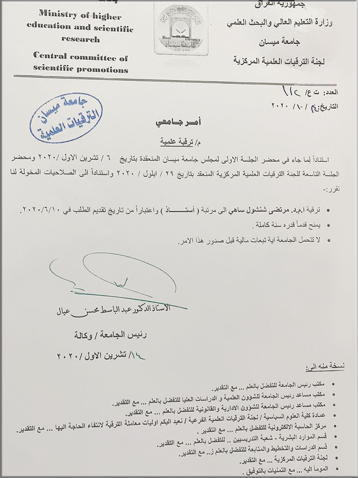 حصل عميد كلية العلوم السياسية في جامعة ميسان الاستاذ المساعد الدكتور ( مرتضى شنشول ساهي) علــى درجــة “استاذ ” وذلك بعــد استيفائه لشروط الترقيــة العلميــة.وبهذه المناسبــة السعيدة فإن رئاسة جامعة ميسان وكلية العلوم لسياسية وكافة منتسبيهــا من تدريسيين وموظفيــن يتقدمــون بالتهنئة الحــارة والأمنيــات العطرة سائليــن المولـى عز وجل له دوام الموفقيــة والســداد وإلى مزيـد من التــألق والتفـوق والازدهار .