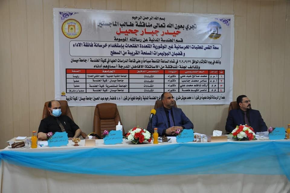شهد قسم الهندسة المدنية في كلية الهندسة جامعة ميسان مناقشة رسالة الماجستير الموسومة Shear Capacity of Near Surface FRP Bars for Multi-Cells UHPC Tapered Beams للطالب “حيدر جبار جحيل” بإشراف م. د. ناصر حكيم طعمة، حيث ترأس لجنة المناقشة ا. م. د. محمد صالح عبد علي وكانت اللجنة بعضوية أ. م. د. سامر محمد جاسب، و م. د. أرشد ناظم محمد علي. الدراسة تناولت التحقق من سلوك القص للعتبات غير الموشورية المتعددة الفتحات باستخدام خرسانة فائقة الأداء وقضبان البوليمرات المسلحة القريبة من السطح. حيث تتكون الدراسة من جزئين، الجزء الأول تناول كيفية الحصول على خرسانة فائقة الأداء من المواد المتاحة في الأسواق المحلية، والجزء الثاني تضمن استخدام هذه الخرسانة في أعمال صب العتبات غير الموشورية وبعدة متغيرات: عدد الفتحات الطولية وموقعها، نسبة حديد التسليح الطولي، نسبة حديد تسليح الركائب، مقدار زاوية الميلان للعتبة، نسبة ألياف الصلب، نسبة فضاء القص إلى العمق الفعال للعتبة، قضبان البوليمرات المسلحة القريبة من السطح وبعدة زوايا، أشرطة البوليمرات المسلحة وبعدة زوايا. أثبتت الدراسة أنه بالإمكان الحصول على الخرسانة فائقة الأداء من المواد المتوفرة محلياً، حيث تم الحصول على مقاومة انضغاط (170) ميكا باسكال ومن عدة تدرجات من الرمل، كما أثبتت الدراسة أن استخدام البوليمرات المسلحة القريبة من السطح أفضل من الركائب المسلحة وكذلك أفضل من أشرطة البوليمرات المسلحة. كما وأظهرت الدراسة إن استخدام التقوية بزوايا مائلة أفضل من التقوية بالاتجاه العمودي. كما وبينت الدراسة أن ألياف الصلب تزيد من مقاومة العتبة بمقدار (300 ٪).