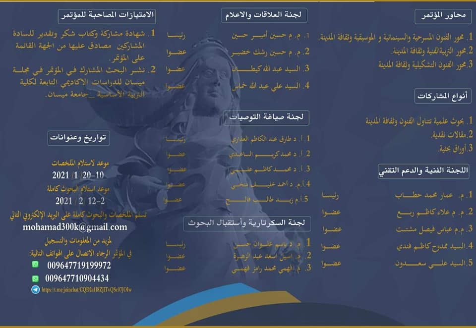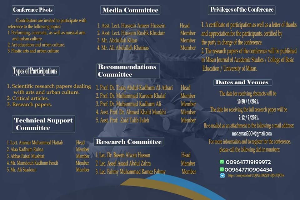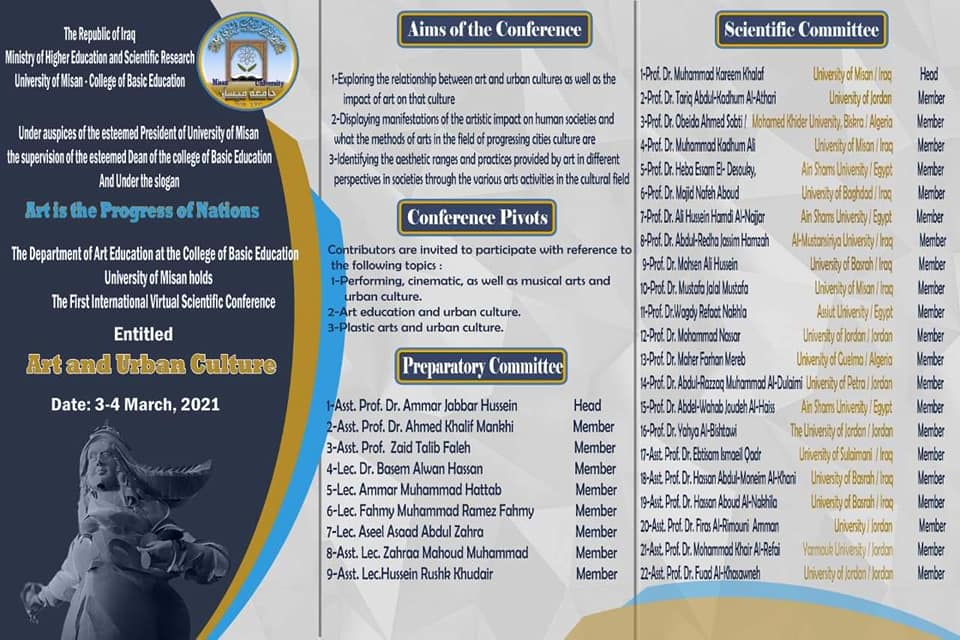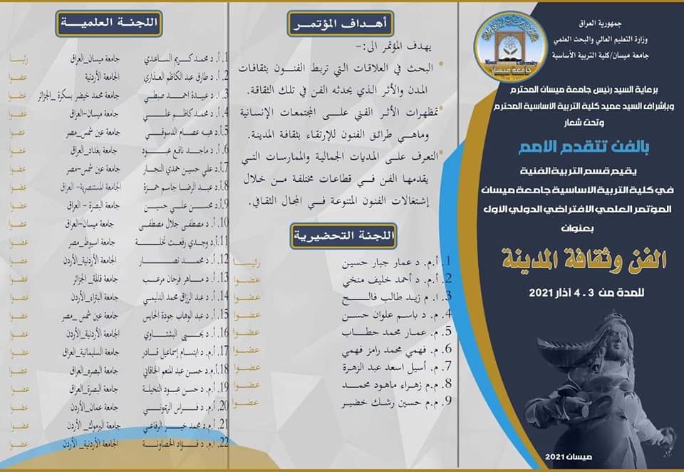 يواصل قسم التربية الفنية في كلية التربية الاساسية جامعة ميسان أستعداداته الفنية واللوجستية لأقامة المؤتمر العلمي الدولي الافتراضي الأول الذي سيقام برعاية الأستاذ الدكتور عبدالباسط محسن عيال / رئيس جامعة ميسان واشراف الأستاذ الدكتور أحمد عبدالمحسن كاظم / عميد كلية التربية الاساسية .. يتناول المؤتمر عنوان الفنون وثقافة المدينة والذي يحمل شعار ( بالفن تتقدم الأمم ) حيث ضمت اللجنة العلمية نخبة من أساتذة الفن والفكر في العراق والوطن العربي وتتضمن المشاركة بحوث واوراق نقدية ومقالات في مجالات الفنون .. وسيقام للمدة من ( ٣ – ٤ ) آذار ٢٠٢١ ويتضمن المؤتمر المحاور الخاصة بالفنون المسرحية التشكيلية والسينمائية والموسيقية وغيرها من اختصاصات الفنون المتنوعة الأخرى .