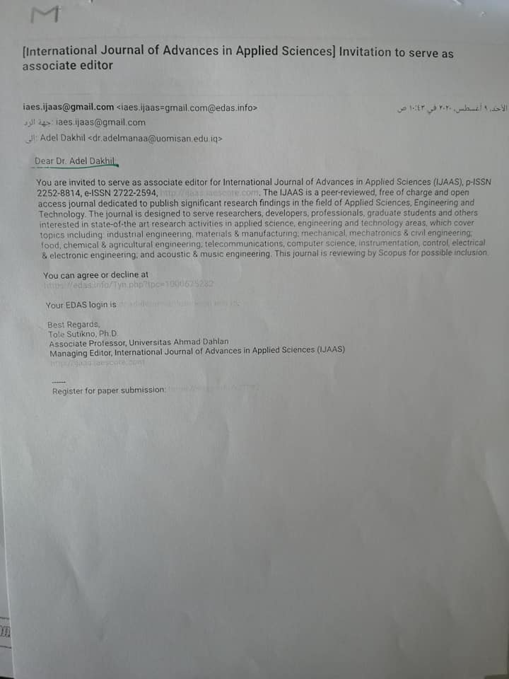 تلقى مساعد رئيس جامعة ميسان للشؤون العلمية والدراسات العليا الاستاذ المساعد الدكتور عادل مانع الكعبي دعوة من المجلة العالمية ضمن مستوعبات سكوبسInternational journal of Advanced in Applied sciences للانظام الى هيئة تحريرها وبصفة محرر مشارك. وتاتي مشاركة العديد من اساتذة جامعة ميسان في هيئات تحرير المجلات العالمية، لمايتمتعوا به من مؤهلات علمية عالية في مختلف التخصصات، والتي تنعكس بدورها على انفتاح الجامعة على الجامعات العالمية والعربية والتلاقح الفكري بين التخصصات المتناظرة.