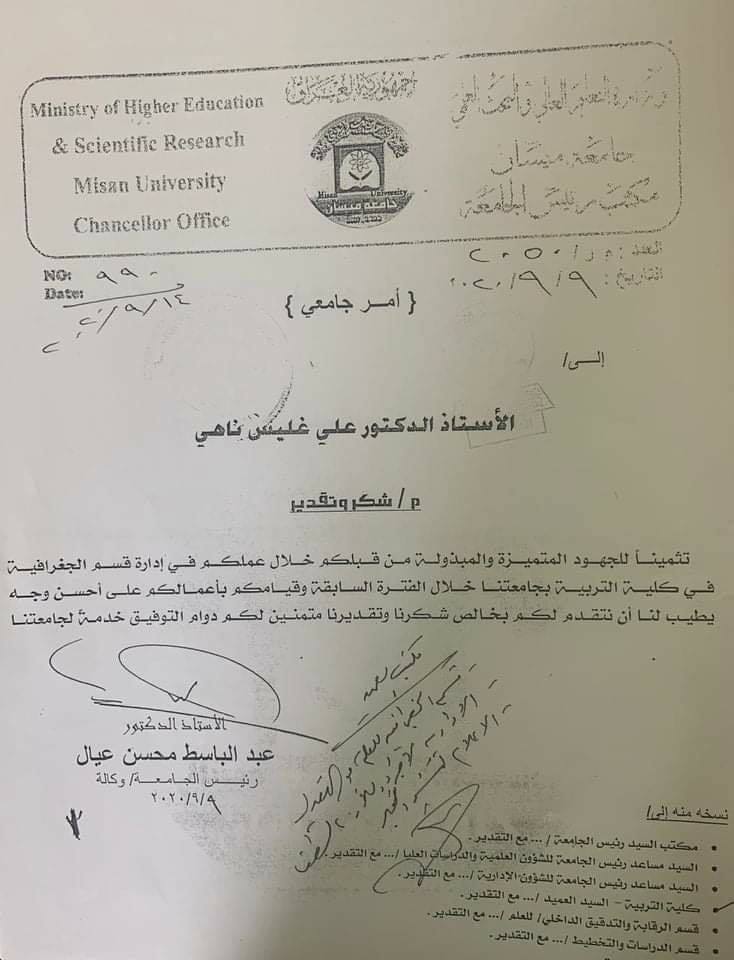 حصل رئيس قسم الجغرافيا السابق الاستاذ الدكتور علي غليس ناهي على كتاب شكر وتقدير من السيد رئيس الجامعة وذلك تثمينا لجهود المميزة في إدارة قسم الجغرافيا في كلية التربية .