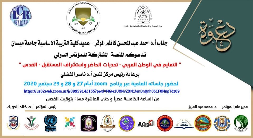 عميد كلية التربية الأساسية يتلقى دعوة رسمية من المنصة المشتركة للمؤتمر الدولي الموسوم ( التعليم في الوطن العربي .. تحديات الحاضر وأستشراف المستقبل – القدس ))