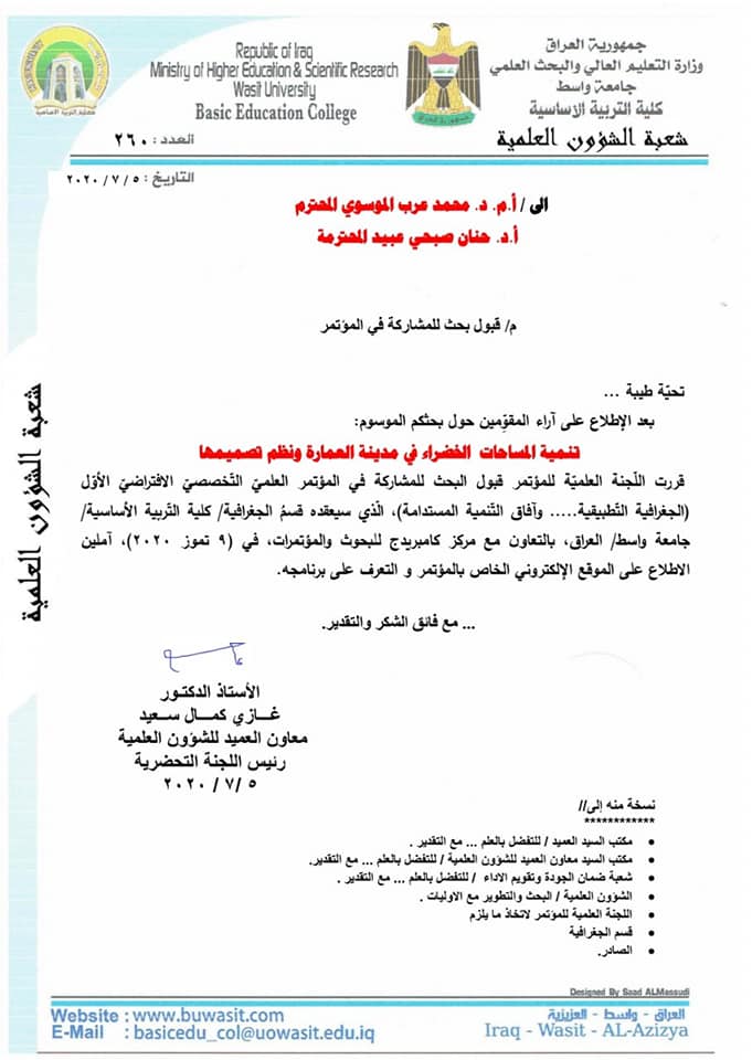 قبول البحث الموسوم (( تنمية المساحات الخضراء في مدينة العمارة ونظم تصميمها ))