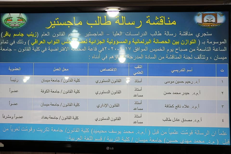 تم مناقشة رسالة ماجستير في كلية القانون جامعة ميسان في يوم الخميس المصادف 17/9/2020 للطالبة زينب جاسم باقر عن الرسالة الموسومة ب (التوازن بين الحصانة البرلمانية والمسؤولية الجزائية لعضو مجلس النواب العراقي )وذلك على قاعة المحكمة الافتراضية في الكلية وحيث شارك عضوا في اللجنة من خارج المحافظة وعبر برنامج ( zoom) وبالتعاون مع مركز الحاسبة في الجامعة .وتألفت لجنة المناقشة من السادة أ.د.رحيم حسين موسى رئيساً ، أ.م.د حيدر محمد حسن عضوآ ، أ.م. د. علاء نافع كطافة عضواً أ.م.د مصدق عادل طالب عضواً ومشرفاً .وتضمنت الرسالة فصلين خصص الفصل الأول لدراسة ، مفهوم الحصانة البرلمانية والمسؤولية الجزائية وبيان اساسهما . , وتطرقت الرسالة في فصلها الثاني الى الاحكام الموضوعية والاجرائية للحصانة البرلمانية من خلال بيان مجالات التطبيق ومدى التوازن بين الحصانة والمسؤولية ومن اهم النتائج التي توصلت اليها الباحثة واهمها هي حالات القصور التشريعي المتعلق بمجالات الحصانة من المسؤولية الجزائية . ومن اهم المقترحات في رسالة الباحثة هي معالجة القصور وبخاصة مايتعلق بضرورة تغيير نطاق الحصانة الموضوعية في مجال الجرائم الجنح التي لاتقل اهمية من الجنايات .وقد قررت اللجنة قبول الرسالة بدرجة جيد جدا .