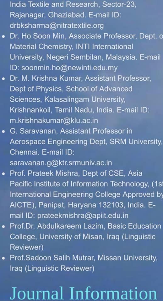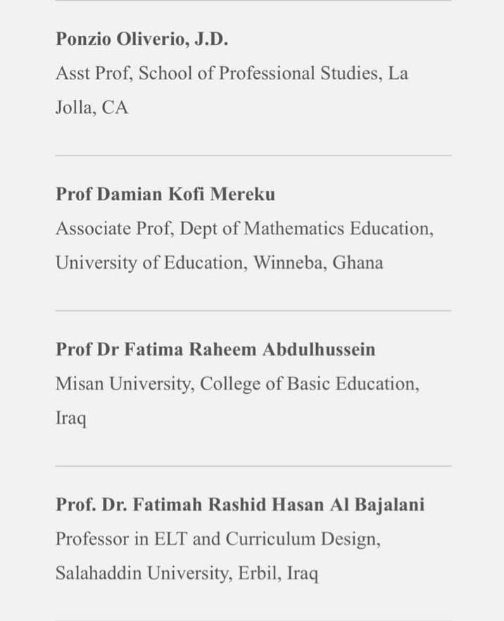 أختارت المجلة الدولية IJDSSH للأبتكارات في الهندسة وتكنلوجيا المعلومات نخبة من أساتذة قسم اللغة الأنگليزية في كلية التربية الأساسية كمقومين فيها ( أ . د عبدالكريم لازم بهير و أ . د فاطمة رحيم عبدالحسين و أ . سعدون صالح مطر ) وذلك لمكانتهم العلمية في كتابة وأعداد ونشر البحوث العلمية الرصينة باللغة الأنگليزية .