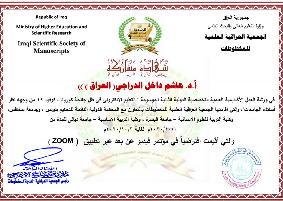 شارك الأستاذ الدكتور هاشم داخل حسين عميد كلية التربية في جامعة ميسان في ورشة العمل الأكاديمية العلمية التخصصية الدولية الثانية الموسومة التعليم الإلكتروني في ظل جائحة كورونا ومن جهة نظر أساتذة الجامعات والتي إقامتها الجمعية العراقية للمخطوطات بالتعاون مع المحكمة الدولية الدائمة للتحكيم بتونس وجامعة صفاقس وكلية التربية للعلوم الإنسانية جامعة البصرة وكلية التربية الإساسية جامعة ديالى والتي أقيمت على برنامج zoom