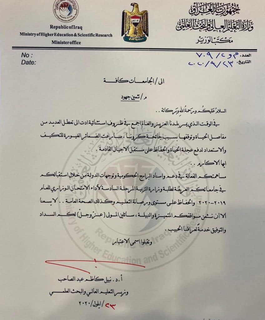 ثمن وزير التعليم العالي والبحث العلمي الأستاذ الدكتور نبيل كاظم عبد الصاحب جهود ومواقف الجامعات والكليات الحكومية والأهلية في دعم وإسناد واستضافة امتحانات السادس الإعدادي.وتضمن كتاب موجه للجامعات كافة بمناسبة انتهاء امتحانات الدور الأول لطلبة الدراسة الإعدادية أن دعم البرامج الحكومية وتوجهات الدولة ولاسيما استضافة الامتحانات الوزارية قد أسهم في الحفاظ على مستوى رصانة التعليم والصحة العامة ويستحق تثمينا يليق بمؤسسات التعليم العالي التي سجلت مواقف متميزة لحماية مستقبل الأجيال القادمة.
