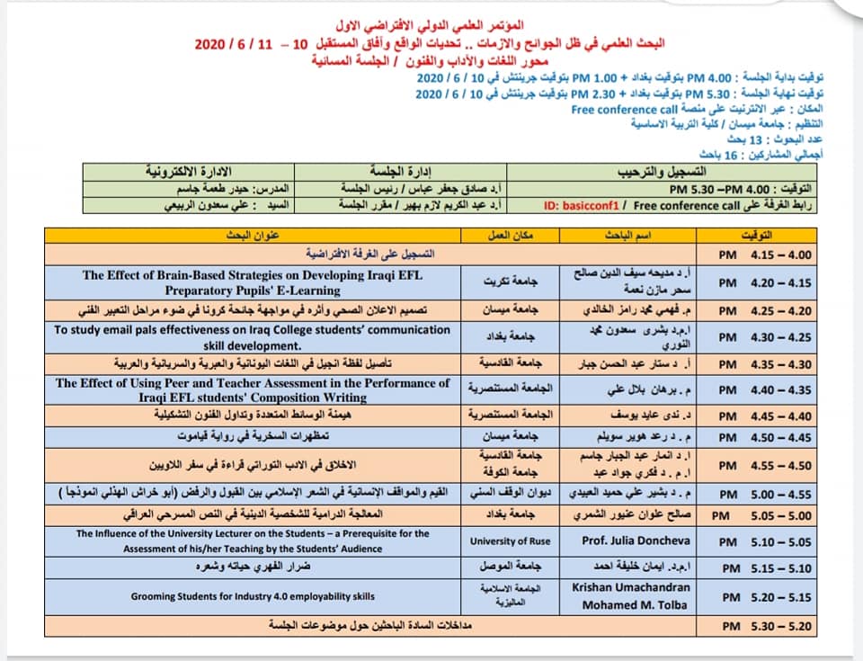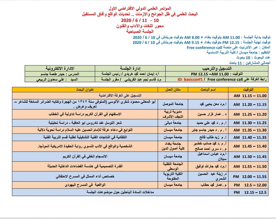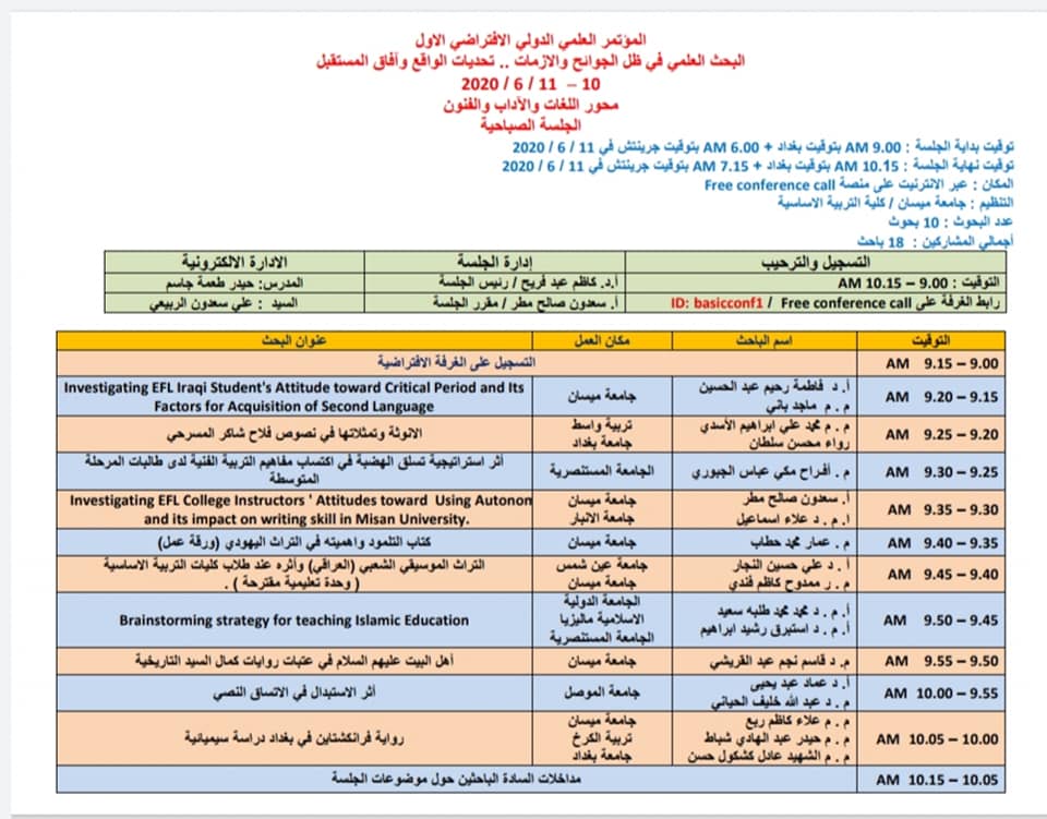 منهاج المحور الأول للمؤتمر العلمي الدولي الأفتراضي الأول الذي تقيمة جامعة ميسان كلية التربية الأساسية