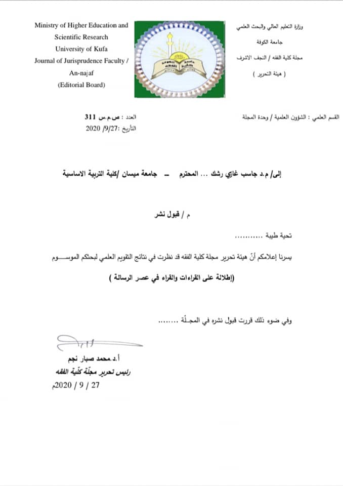 نشرت مجلة كلية الفقة الصادرة عن جامعة الكوفة للتدريسي في جامعة ميسان / كلية التربية الأساسية الدكتور جاسب غازي رشك بحثه الموسوم ( إطلالة على القراءات والقراء في عصر الرسالة )