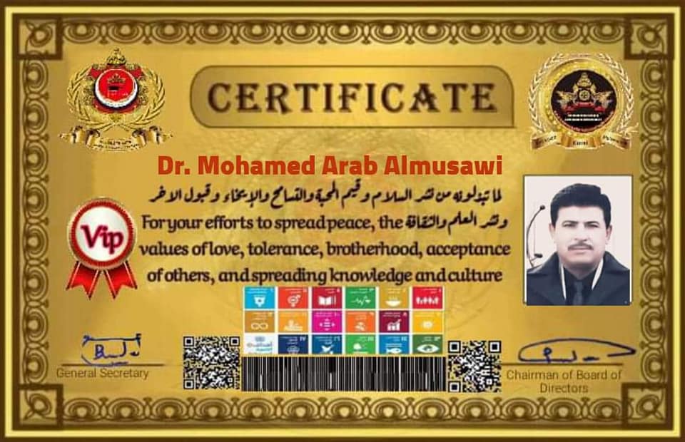 شهاده شكر وتقدير الى الأستاذ الدكتور محمد عرب الموسوي التدريسي في جامعة ميسان / كلية التربية الأساسية لجهوده ومساهماته في الندوات والورش التي أقامها المركز عن طريق المنصات الألكترونية أضافة لتكريمه بعد حصوله على عضوية منظمة الكرامة لحقوق الانسان والسلم الدولية .
